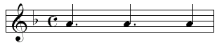 L’opzione Usa l’elenco può produrre effetti interessanti se la forma eseguibile regola il pitch o Ribattere i tasti (ribattere i tasti è una definizione di playback che potete assegnare a qualsiasi espressione; la nota alla quale è attaccata è suonata ripetutamente, ad un intervallo specificato nel settaggio Rapporto tempo). Creando una lista delle campionature ed inserendo i vostri valori con attenzione, potete creare un’espressione Ribattere i tasti che suona un certo ritmo. Supponete, ad esempio,che la vostra forma definita per l’effetto Ribattere i tasti venga applicata ad una nota intera ed abbia un Rapporto tempo di 1:1 (la nota viene ribattuta in crome). Se selezionate l’opzione Usa l’elenco ed inserite 3, 3, e 2 nei primi tre riquadri, la nota intera interessata suonerà con questo ritmo: