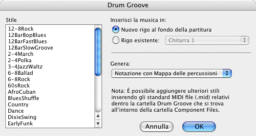Da questo elenco scegliete lo stile che desiderate per le percussioni della vostra partitura. Il drum groove che sceglierete dovrebbe corrispondere per quanto riguarda il tempo alle indicazioni della vostra partitura. Ad esempio, il Jazz Waltz andrebbe applicato ad una sezione di musica in tempo ternario. Se la regione selezionata supera la durata del drum groove scelto, questo verrà ripetuto fino al termine della regione stessa. Ciascuno di questi stili corrisponde ad un file MIDI nella cartella Finale 2010/Component Files/Drum Groove. Come annotato nella stessa finestra di dialogo, potete aggiungere elementi a questa cartella (e quindi all’elenco) inserendo un qualsiasi file MIDI con una traccia di percussioni (sul canale 10).