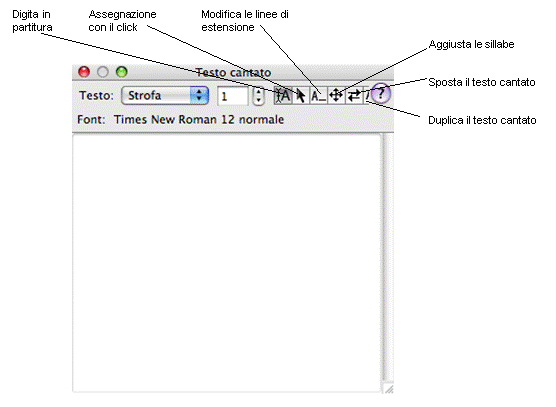 Quando dal menu Canto selezionate Assegnazione con il click, nell'area di visualizzazione della finestra del testo cantato verrà segnalata la prossima sillaba che sarà inserita. Cliccate sulla nota alla quale volete assegnare la sillaba evidenziata ed essa verrà inserita in partitura; nell'area di visualizzazione verrà evidenziata la sillaba successiva, ad indicare che sarà la prossima ad essere inserita. Se volete inserire una sillaba diversa da quella evidenziata automaticamente, cliccate a sinistra della sillaba che avete scelto. Potete spostare la finestra del testo cantato trascinandone la barra del titolo e chiuderla cliccando sul box di chiusura. Se cliccate su una nota mentre tenete premuto il tasto
