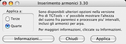 scegliete TGTools, quindi Inserimento semplice degli armonici. Se non selezionate una regione specifica, all’avvio del plug-in Finale visualizzerà un messaggio d’avvertenza per chiedervi se volete processare l’intera partitura.