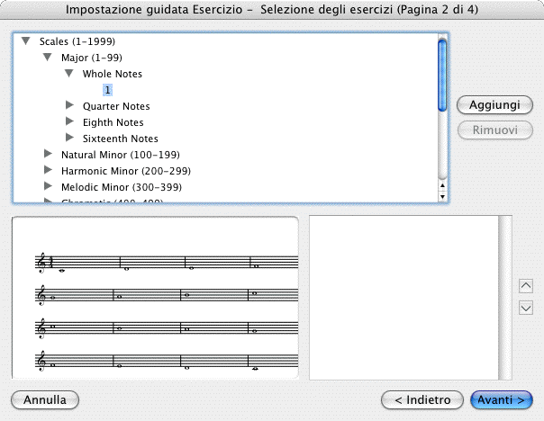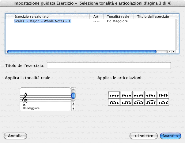 L’Impostazione guidata Esercizo vi consente di impostare una lezione per il vostro gruppo vocale o strumentale basata su esercizi a vostra scelta. L’Impostazione guidata Esercizio include una grande selezione di esercizi tra cui scegliere, inclusi scale, intervalli, e arpeggi. Mescolate e cercate gli esercizi con cui desiderate pianificare la lezione. Potete anche condividere le lezioni con altri allievi o insegnanti. Potete applicare diverse tipologie di articolazione della frase o cambiare la tonalità. È possibile inoltre specificare la tipologia di strumenti e il numero di copie che devono essere stampate per ciascuna lezione.