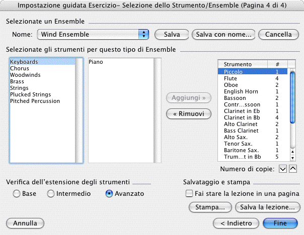· Avanzato. Selezionate il livello di abilità del vostro ensemble. L’Impostazione guidata Esercizi trasporrà le ottave degli esercizi in modo da farle rimanere in un ambito accettabile per ciascuno strumento relativamente al livello di abilità selezionato. L’ambito intervallare di ciascuno strumento e definito nel file Instrument.txt. Si veda a riguardo Configurazione del file