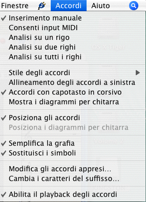 Finale, se lo desiderate, è in grado di aggiungere automaticamente nel vostro brano i simboli degli accordi. Nel menu Accordi, potete scegliere fra tre metodi automatici di analisi degli accordi, in aggiunta al metodo manuale.