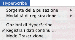 Il sottomenu Modalità di registrazione contiene una serie di comandi per registrare una performance tanto in doppio che in singolo sistema di righi, e il comando di registrazione multitraccia, che vi permette di registrare segnali simultanei da canali diversi in righi multipli o livelli diversi dei righi.