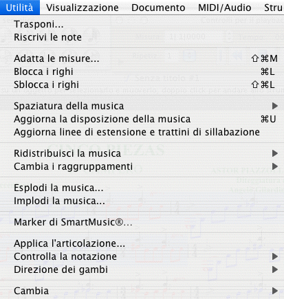 Il menu Utilità è uno dei più versatili menu di Finale. Utilizzando i comandi e le opzioni che contiene potrete apportare molte importanti modifiche alla vostra musica e alla partitura. I comandi di questo menu sono utilizzabili quando selezionate la musica. Potete applicarli sia a tutta la partitura che alla selezione di una singola pulsazione. A meno di indicazione diversa date per assodato che i comandi del menu lavorano sia su selezione completa che su selezione parziale. Potete selezionare la musica con qualsiasi Strumento che ve lo permetta (Strumento Rigo, Strumento Misure, ecc.), per quanto lo strumento principale in questo genere di operazioni sia lo Strumento Selezione.