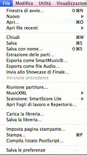 Come in molti programmi, il menu File contiene i comandi per aprire, chiudere, salvare e stampare documenti. Il menu File contiene anche i comandi per importare ed esportare librerie (documenti contenenti vari simboli, segni, ed altri elementi musicali che sono immagazzinati separatamente e possono essere importati in qualunque documento). Infine, il menu File contiene il comando Chiudi usato per uscire dal programma.
