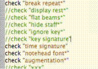 staff line thickness = 2.7 evpus check Use Straight Flags select Flatten All Beams uncheck Allow Rest To Float //Le opzioni relative a caselle di selezione possono essere combinate con 'no' o 'non' (es: 'non usare trattini intelligenti'). (don't) use engraver slurs (don't) use cross-layer accidentals (don't) use smart hyphens (don't) use smart extensions |