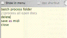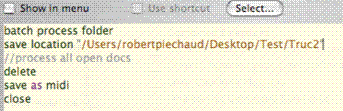 source batch folder "/Users/main/Desktop/Music" load folder "/Users/main/Desktop/Music" load folder "Mac HD:Users:main:Desktop:Music" //oppure, ‘HFS’ style load folder "\Users\main\Desktop\Music" destination batch folder "/Users/main/Pictures/EPS" save folder "/Users/main/Pictures/EPS" //uguale |