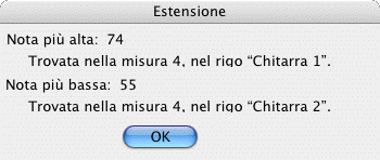 Dopo aver attivato il plug-in Trova l’estensione compare una finestra che contiene la lista delle note più acute e più gravi trovate nella selezione. La finestra indica inoltre il rigo e la misura in cui si trovano queste note. Il plug-in scorrerà il documento fino a che tali note non saranno visibili (scorre fino alla nota che compare per prima). Il plug-in Trova l’estensione usa sempre il numero della nota MIDI, a prescindere dalle impostazioni di Rappresentazione altezza impostate nella finestra Opzioni del programma. Si veda la finestra di dialogo Opzioni del programma - Viste.