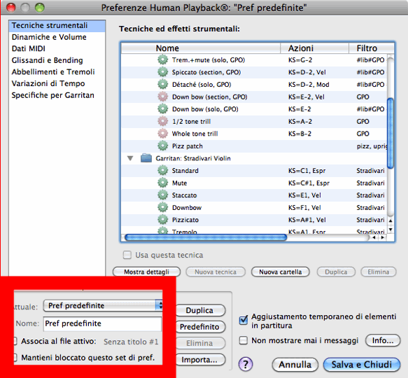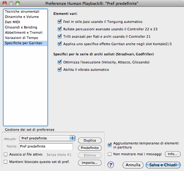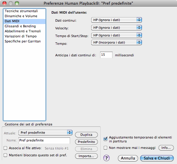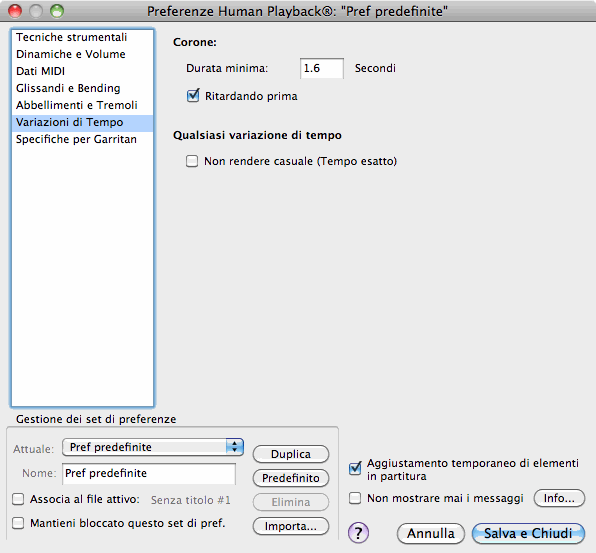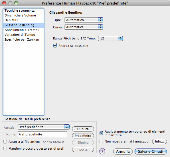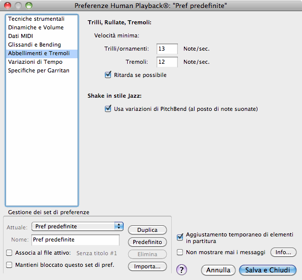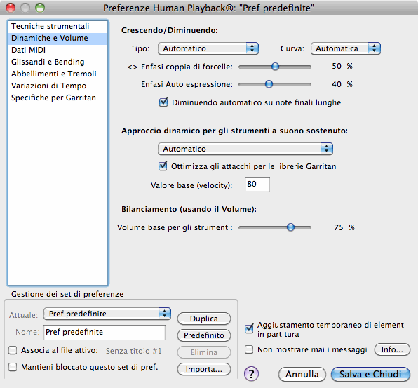 Il set predefinito di preferenze di Human Playback viene chiamato "Preferenze predefinite." Questo è il set che viene utilizzato in tutti i file di Finale se non vi sono specifiche diverse. Quando apportate una qualsiasi modifica alle preferenze di Human Playback, verrà salvata automaticamente in questo set (a meno che non sia selezionata l'opzione "Mantieni bloccato questo set di preferenze").