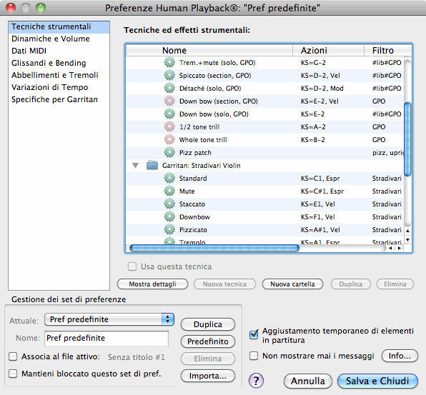 Le opzioni contenute in questa sezione della finestra di dialogo Preferenze di Human Playback determinano il modo in cui Human Playback interpreta le tecniche di esecuzione specifiche degli strumenti (come il pizzicato, il mute, e così via). Potete abilitare o disabilitare le singole tecniche e personalizzarle per adeguarle ancor meglio alle vostre esigenze. Il set Preferenze predefinite contiene le impostazioni predefinite per le tecniche e gli effetti strumentali che vengono utilizzate con gli strumenti della GPO nella versione integrale, nella versione per FInale e in quella JABB, nonché per il violino solo Stradivari. Molte di queste tecniche sono vincolate agli strumenti dotati di keyswitch;. per poterne sentire gli effetti in playback devono essere caricate queste versioni degli strumenti e devono essere utilizzate in partitura le apposite espressioni, articolazioni, ecc, configurate come attivatori delle tecniche - si veda la sezione Keyswitches.