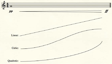 Ecco un'illustrazione grafica che esemplifica gli effetti delle tre tipologie di curva per i crescendo e i diminuendo: