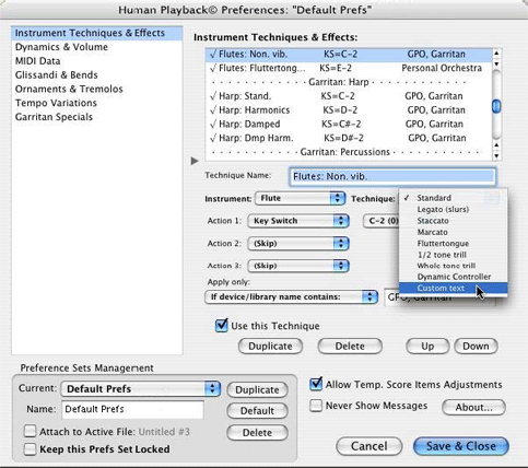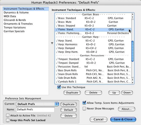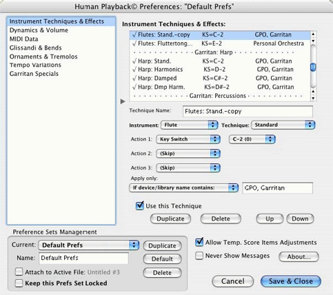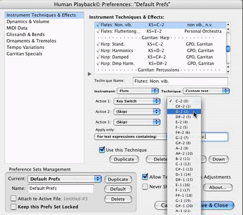 MakeMusic e Garritan hanno, con uno sforzo congiunto, risolto per voi questo problema in Finale 2009. Garritan ha preparato un set di strumenti della GPO configurati espressamente per Finale. Questi strumenti utilizzano dei keyswitch unificati. Garritan comprende adesso anche la versione Notation di tutte le sue librerie di strumenti virtuali, incluso un seti di keyswitch che possono essere utilizzati con Finale. Inoltre Human Playback, in Finale 2009 è stato ottimizzato per lavorare con i keyswtches senza necessità alcuna di configurare delle espressioni apposite. Human Playback è adesso in grado di riconoscere automaticamente se state utilizzando gli strumenti Garritan e, se è così, invia correttamente i keyswitches necessari. Ad esempio, se Human Playback rileva la presenza dell'espressione "pizz." nel rigo del violino, invierà il keyswitch che attiva la tecnica del pizzicato. Qualora incontrasse un'articolazione " " attaccata ad una nota nel rigo per l'arpa, invierebbe il keyswitch per l'attivazione dei suoni armonici.