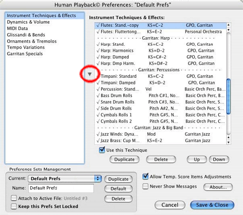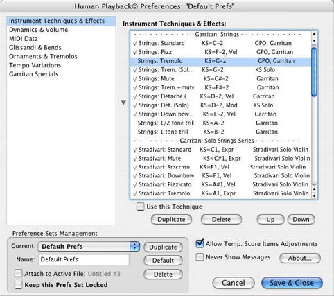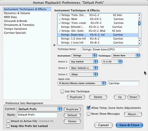 Andate alla sezione Tecniche ed effetti strumentali della finestra di dialogo Preferenze di Human Playback e, nella cartella "Garritan: Archi" selezionate la tecnica "Détaché (solo, GPO)", quindi deselezionate l'opzione "Usa questa tecnica"; ripetete l'operazione per la techina "Down bow (section, GPO)":