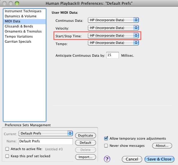 - Randomizzare gli attacchi.In alcuni casi potreste sentire dei pops o dei clic quando il playback sta eseguendo una sezione “tutti” della partitura (cioè un passaggio in cui tutti gli strumenti della partitura devono iniziare una nota nello stesso istante). Questo, durante il playback con gli strumenti della GPO, per Finale è abbastanza semplice, in quanto la gran parte degli stili di Human Playback comportano degli attacchi leggermente sfalsati, tuttavia potete aumentare questo effetto utilizzando lo Strumento MIDI (si veda la finestra di dialogo Modifica casuale nel Manuale dell’utente di Finale per maggiori informazioni). Se procedete in questo modo, assicuratevi che nella sezione Dati MIDI dell’utente della finestra di dialogo Preferenze di Human Playback sia selezionata l’opzione HP (Incorpora i dati) nel menu a discesa Tempo di Start/Stop nel pannello "Dati MIDI" della finestra di dialogo Preferenze di Human Playback.