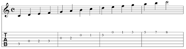 - Al termine del conteggio delle due battute a vuoto, suonate una scala di Do maggiore con estensione di due ottave iniziando dal Do centrale (quinta corda) come viene mostrato nell’esempio sottostante.