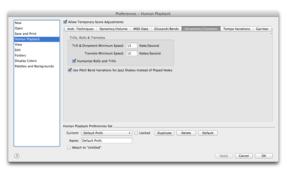 Human Playback Preferences - Ornaments/Tremolos dialog box