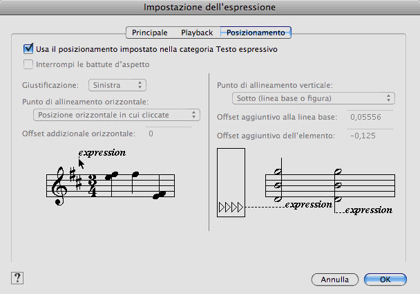 e fate doppio click su una nota o su una misura. Apparirà la finestra di dialogo Selezione dell'espressione. Selezionate un'espressione dalle categorie disponibili e poi cliccate su Modifica, oppure cliccate direttamente su Crea. Apparirà la finestra di dialogo Impostazione delle espressioni. Cliccate sul pannello Posizionamento.