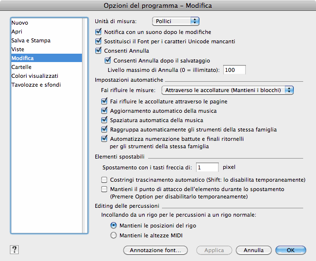 In questa sezione della finestra di dialogo potrete specificare le impostazioni per la funzione di Annulla del menu Modifica, le impostazioni per gli elementi spostabili e le annotazioni sui caratteri.