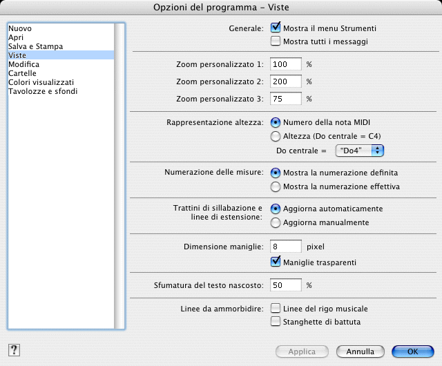 Queste opzioni vi permetteranno di determinare le modalità di visualizzazione di alcuni elementi del programma della partitura.