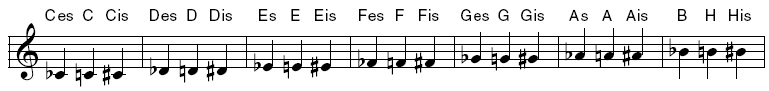 Quando viene selezionata questa opzione Finale mostra la fondamentale e il rivolto come lettere. Una eventuale alterazione, segue la fondamentale. Questo stile mostra “es” per l’indicazione di bemolle, e “is” per quella del diesis, con le seguenti eccezioni: il Mi bemolle viene mostrato come “Es”; il La bemolle viene indicato come “As”; il Si bemolle appare come B, mentre il Si naturale appare come H.