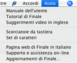 Il Menu Aiuto vi offre diversi strumenti, alcuni anche molto potenti, per conoscere meglio Finale, imparare ad utilizzarlo, fornisce strumenti per risolvere dubbi o difficoltà. Potete anche richiamare le informazioni su una particolare finestra di dialogo o su uno specifico comando di un menu, premendo F1.