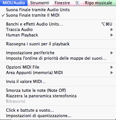 Il menu MIDI/Audio è uno dei menu fissi di Finale.