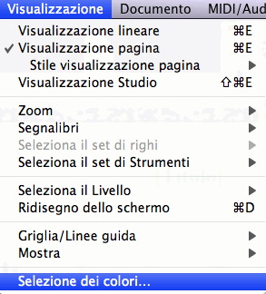 Questo menu contiene comandi pertinenti la visualizzazione della vostra partitura. Non si potrà mai modificare la partitura con i comandi di questo menu, ma solo il modo di visualizzarla sullo schermo. L’unica eccezione è rappresentata dal comando Mostra solo il livello attivo. Questo vi consente di effettuare delle operazioni su un solo Livello alla volta, inclusa la stampa