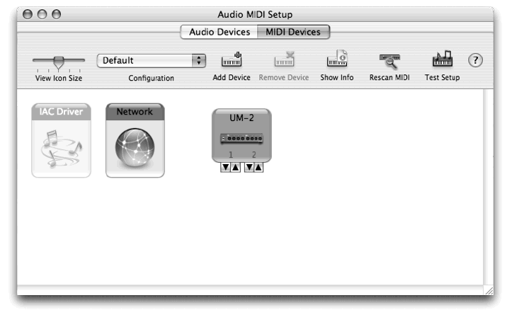 - Cliccate sul pannello Periferiche MIDI. L'impostazione Audio MIDI avvierà una ricognizione in cerca di software e hardware MIDI presenti sul vostro computer. In seguito a questa ricerca apparirà la vostra interfaccia MIDI. Se il vostro computer non dovesse riconoscere la vostra periferica, consultate la documentazione della periferica stessa, per avere istruzioni tecniche più dettagliate.