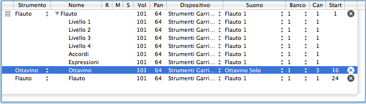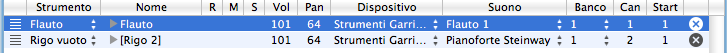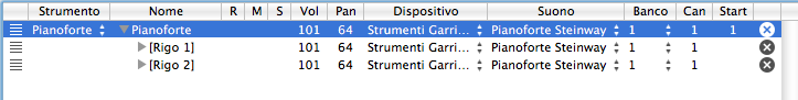 I righi condividi da uno stesso strumento, presentano anch'essi il pulsante per il trascinamento e la disposizione in partitura