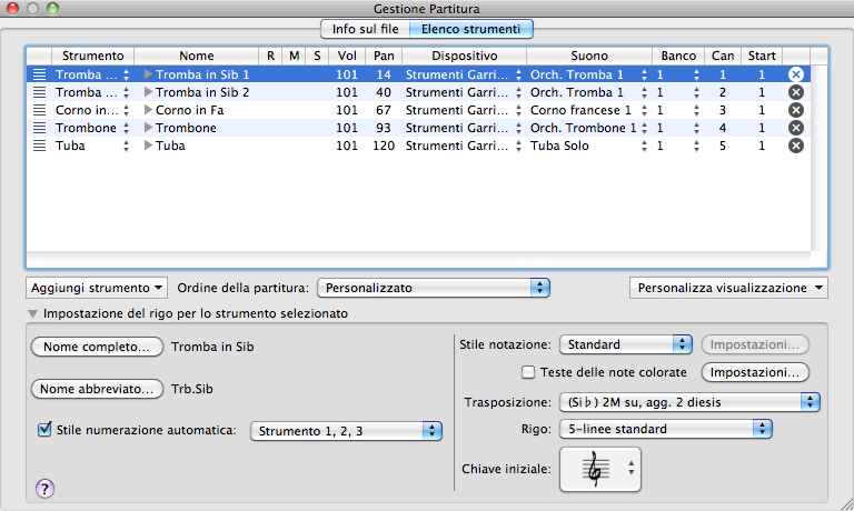 La finestra Gestione partitura, vi permette di visualizzare e modificare tutti gli aspetti riguardanti gli strumenti della partitura, quale l'ordine in partitura, la configurazione per il playback e le impostazioni del rigo.