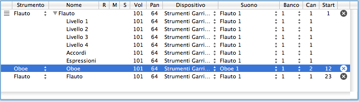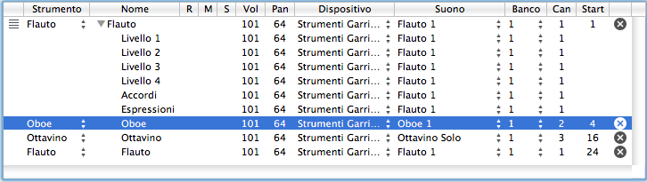 I cambi di strumento sono sempre, in elenco, dopo le altre righe di informazioni sullo strumento principale.