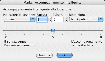 - Cursore (Accompagnamento intelligente). Questo cursore è disponibile quando un marker di questo tipo è selezionato dalla lista e nella parte a destra della finestra di dialogo. Muovendo il cursore verso destra si incrementa il livello dell’accompagnamento intelligente, mentre spostandolo verso sinistra il livello viene abbassato. Quando il cursore è posizionato sullo 0, l’accompagnamento non sarà effettuato (il solista deve seguire l’accompagnamento); quando il cursore sarà spostato sul 10, l’accompagnamento sarà portato al massimo livello di autonomia (l’accompagnamento seguirà il solista). Cliccate su Selezione per rendere effettivo il livello indicato dal cursore, per il marker selezionato.