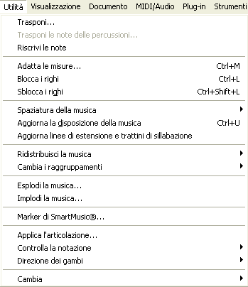Questo nuovo menu fisso di Finale comprende una parte dei comandi e dei sottomenu prima contenuti nel Menu Modifica-Massa. I comandi che possono essere applicati all’intera partitura sono sempre disponibili, mentre quelli che necessitano di una selezione sono disabilitati se non si seleziona prima una regione, una misura (in modo completo o parziale). Si veda menu Utilità.