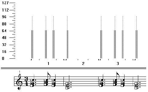 Una volta eseguita la selezione, attivate l’opzione Alterazione percentuale nel menu Strumento MIDI. Aumentate tutte le Key Velocity del 150% (ad esempio) rispetto al loro valore corrente; la melodia interna viene immediatamente posta in evidenza. Nel grafico è visualizzata la situazione, con le barre che rappresentano la voce intermedia più lunghe del 50% rispetto alle altre barre che rappresentano le note dell’armonia.