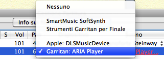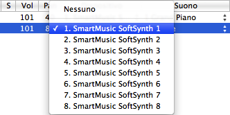 Notate che nell'esempio in immagine raffigurato sopra, entrambi gli strumenti sono assegnati al canale 1, ma in realtà non si tratta dello stesso canale, in quanto i due strumenti sono assegnati a due periferiche diverse; si tratta dunque del canale 1 di due periferiche distinte, quindi di due strumenti diversi.Infatti l'Oboe è assegnato alla periferica SmartMusic SoftSynth 2 (in pratica il canale 1 al quale è assegnato l'Oboe corrisponde al canale 17 di Finale).