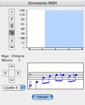 Quando ritornate alla inestra dello Strumento MIDI, la visualizzazione diviene di tipo grafico; l’area evidenziata rappresenta il valore del controller nel tempo. Un “righello di valore” appare sul lato sinistro, che va da 0 a 127. Questa scala misura quantità e qualità differenti, a seconda del controller selezionato.