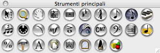 Questa tavolozza contiene tutti gli Strumenti principali di Finale, potete aggiustarla o nasconderla. Cliccate sul nome dello Strumento nel disegno sottostante per visualizzare quella sezione di documentazione.
