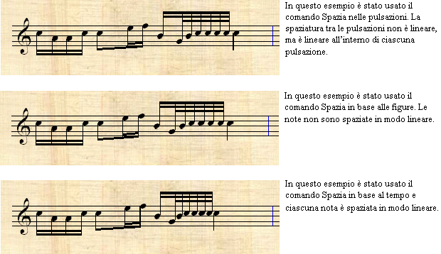 Questi comandi, che hanno effetto su selezioni di misure complete, sono una delle caratteristiche più uniche di Finale. Infatti vi consentono di spaziare le note e le misure come farebbe un incisore di musica professionista—utilizzando una tabella specifica di valori relativi di distanza per ciascuna figura, e spaziando le note e le misure su questa base. Il risultato è quello di una spaziatura non proporzionale, dove una semibreve non occupa lo spazio di quattro semiminime, ma uno spazio decisamente minore.
