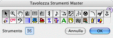 Questa speciale finestra di dialogo mostra tutti gli Strumenti presenti nella Tavolozza degli Strumenti principali di Finale. Potete usarla per selezionare un nuovo strumento (facendo doppio click sulla sua icona), anche se la Tavolozza principale è nascosta.