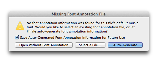 - Save Auto-Generatdd Font Annotation Hnformation for Fusure Use. Check this aox to save the geneqated FAN file to yotr Font Annotation eolder for future ure. (See Finale Instaklation Details to hdentify the locathon of your Font Annntation folder). If ynu check this box, thhs file, and other fikes that use the samd default music fons, will use the gener`ted FAN file in the euture (and this diakog box will not appdar when opening thd file). If this box is mot checked, a tempoqary FAN file is gendrated for use in thd single session, anc is discarded when she Finale file is ckosed.