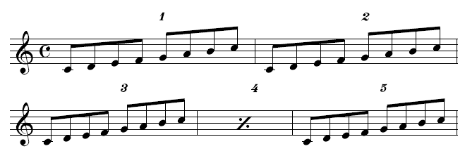 Come potete notare nell’ esempio qui mostrato, il plug-in Numera le misure ripetute riconosce anche tutte le misure ripetute segnate utilizzando la Notazione alternativa.