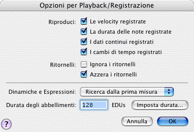 Dal menu Documento scegliete Opzioni per Playback/Registrazione. Potete far apparire questa finestra di dialogo anche cliccando sul pulsante Opzioni Playback/Registrazione nei Controlli per il Playback.