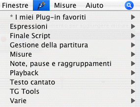 è attivabile se nel vostro sistema sono disponibili i Plug-in di Finale. Finale viene fornito con un certo numero di Plug-in che vengono installati insieme al programma stesso. A meno che non abbiate fatto un’installazione personalizzata, o abbiate rimosso o cambiato il nome della cartella Plug-in nella vostra cartella Finale, dovreste visualizzare il menu
