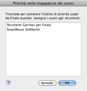 Finale dispone di varie Mappe dei suoni, che vengono utilizzare per collegare gli strumenti di Finale con i suoni delle diverse librerie residenti, compresi i suoni delle librerie Garritan e SoftSynth. Per assegnare automaticamente i suoni agli strumenti Finale necessita di una guida che determini quali suoni selezionare per ciascuno strumento nel caso in cui non ci sia corrispondenza nella libreria predefinita o selezionata. Questa finestra di dialogo vi consente di stabilire la priorità delle librerie disponibili, in modo che possiate creare una vera e propria gerarchia. Se nella vostra Mappa dei suoni prioritaria (preferita) non è disponibile il suono per uno strumento della partitura, Finale farà riferimento alla seconda Mappa in elenco, e così via.