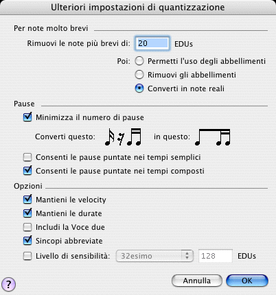 • Annulla. Cliccate OK per cambiare il vostro settaggio di quantizzazione e ritornare alla partitura. Cliccate Annulla per ritornare alla partitura senza apportare nessuna modifica.