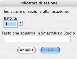 Dal menu Utilità scegliete Aggiungi Marker di SmartMusic. Nella parte sinistra della finestra di dialogo che apparirà (un elenco delle varie tipologie di markers disponibili) selezionate Indicatore di sezione e cliccate su Aggiungi. Nel caso abbiate già inserito in precedenza un marker di questo tipo, selezionatelo nella parte centrale della finestra di dialogo e cliccate su Modifica. In entrambi i casi apparirà la finestra di dialogo indicatore di sezione.