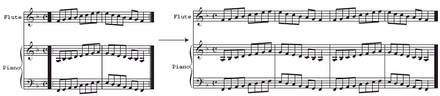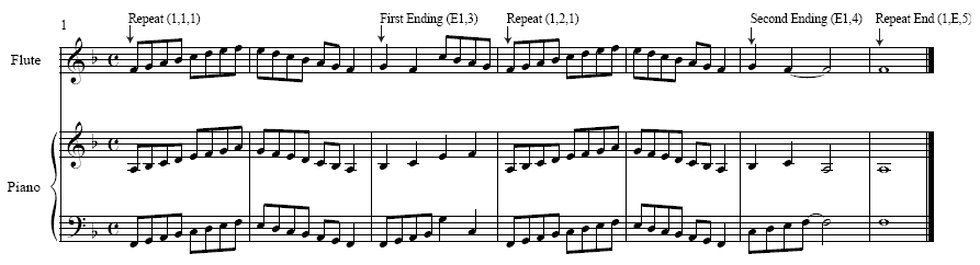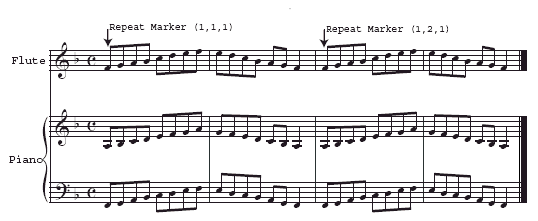 Nell’immagine qui sopra vi mostriamo una sezione di musica duplicata per essere compatibile con SmartMusic Studio. Un simbolo di espressione definito come marker di tipo Repeat appare all’inizio di ciascun passaggio della sezione ripetuta. I numeri fra parentesi indicano i valori dei parametri r, t ed m (assumendo che questo esempio inizi a battuta 1)).