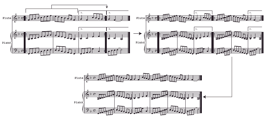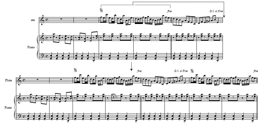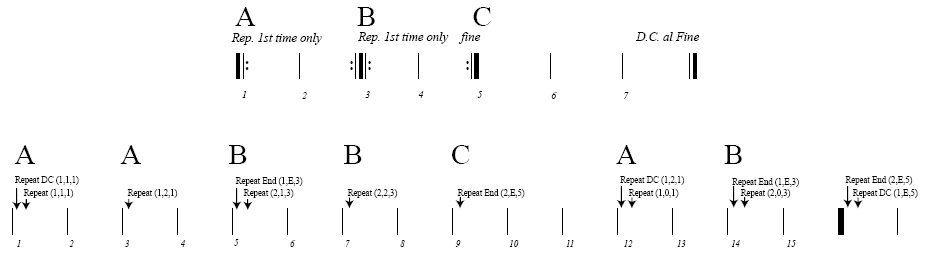 La mappa seguente esemplifica il caso di una ripetizione di tipo D.C. al Fine. La sezione superiore mostra la disposizione delle ripetizioni nel file originale. La parte sottostante mostra la musica trascritta per esteso e con la giusta sequenza e il posizionamento corretto dei marker.