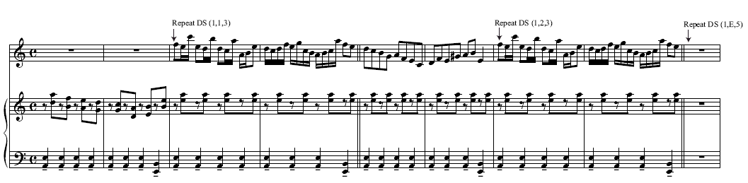 Se nella partitura originale vi è una ripetizione del tipo Dal Segno, è necessario definire un simbolo di espressione come marker di tipo ripetizione DS per indicare il primo passaggio sul Segno, la sezione D.S. e la fine di questa sezione stessa. I parametri per definire questo tipo di marker vanno inseriti nel campo di testo Descrizione della sezione Testo della finestra di dialogo Impostazione delle ripetizioni testuali, come mostrato nell’esempio qui sotto riportato: